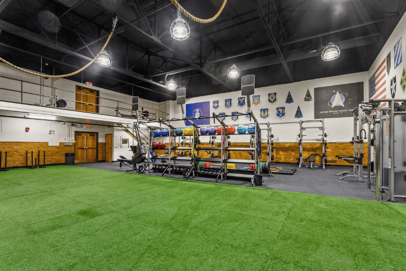 Located inside Memorial Hall, the space formerly served as Harrisonburg High School’s auxiliary gym and had once been used by JMU’s Fencing Club. The renovation’s scope of work included the installation of: a combined flooring system, comprised of interlocking rubber floor tiles and artificial turf, new wall graphics featuring the various emblems of the military branches and the American flag, new double doors between the gym and existing classroom space, and new gym equipment. We also updated the electrical system, laminated drywall over the gym’s existing plaster ceiling, painted the ceiling black, and maintained the existing walls, chair rail, mezzanine, and brick façade.