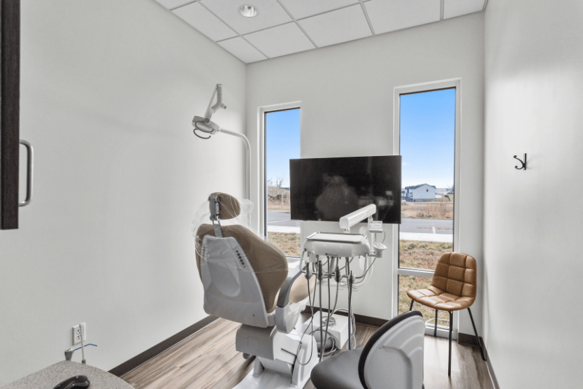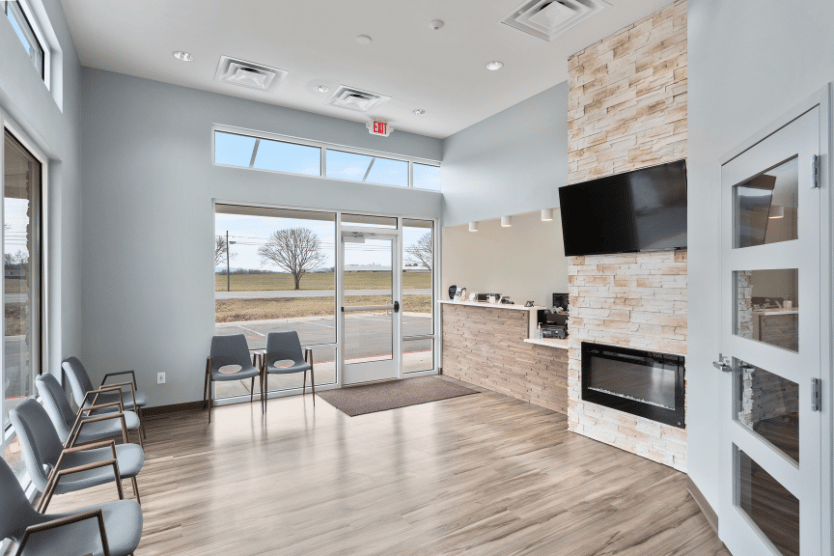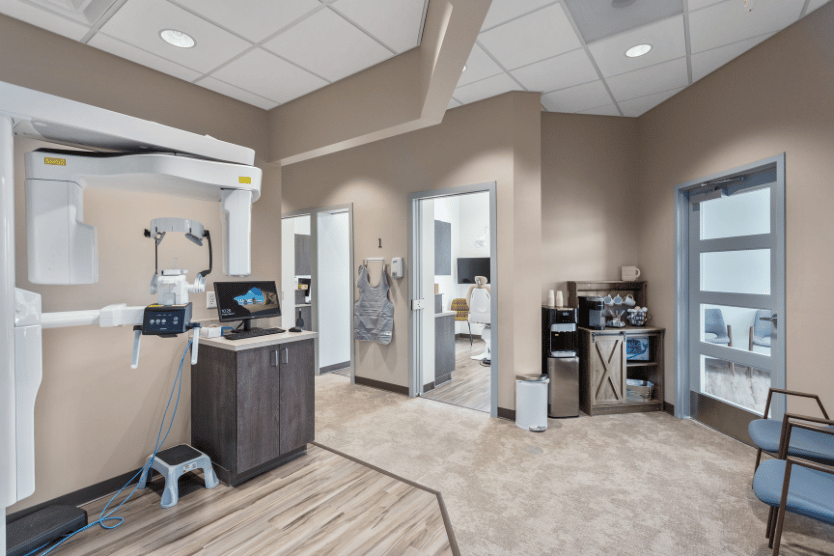 The natural light, color palette, and decorative walls and flooring help to create an inviting space for both staff and clients of this busy dental practice.